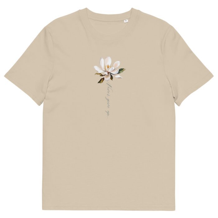 Aukštos kokybės, organinės medvilnės marškinėliai su užrašu „Never give up…” pagaminti iš 100% ORGANINĖS medvilnės – tai puikus pasirinkimas ekologiškai sąmoningiems pirkėjams.